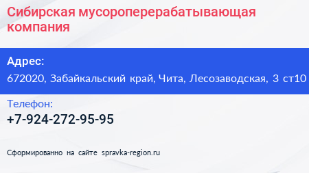 Сибирская мусороперерабатывающая компания по адресу 672020, Забайкальский край, Чита, Лесозаводская, 3 ст10 в дальнейшем Организация, размещена в следующих категориях: