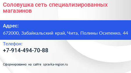 Соловушка, сеть специализированных магазинов по адресу 672000, Забайкальский край, Чита, Полины Осипенко, 44 в дальнейшем Организация, размещена в следующих категориях: