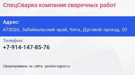 СпецСварка, компания сварочных работ по адресу 672026, Забайкальский край, Чита, Дуговой проезд, 10 в дальнейшем Организация, размещена в следующих категориях: