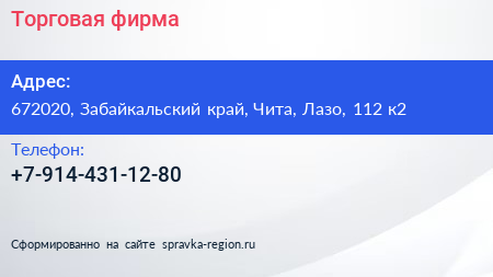 Торговая фирма по адресу 672020, Забайкальский край, Чита, Лазо, 112 к2 в дальнейшем Организация, размещена в следующих категориях: