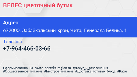 ВЕЛЕС, цветочный бутик по адресу 672000, Забайкальский край, Чита, Генерала Белика, 1 в дальнейшем Организация, размещена в следующих категориях: