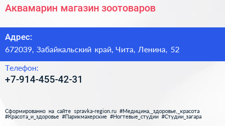 Аквамарин, магазин зоотоваров по адресу 672039, Забайкальский край, Чита, Ленина, 52 в дальнейшем Организация, размещена в следующих категориях: