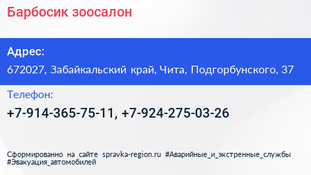 Барбосик, зоосалон по адресу 672027, Забайкальский край, Чита, Подгорбунского, 37 в дальнейшем Организация, размещена в следующих категориях: