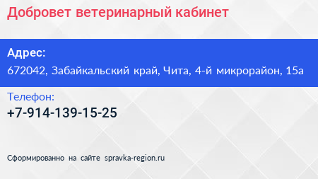 Добровет, ветеринарный кабинет по адресу 672042, Забайкальский край, Чита, 4-й микрорайон, 15а в дальнейшем Организация, размещена в следующих категориях: