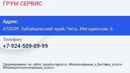 ГРУМ СЕРВИС по адресу 672039, Забайкальский край, Чита, Ингодинская, 6 в дальнейшем Организация, размещена в следующих категориях: