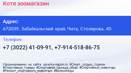 Котя, зоомагазин по адресу 672039, Забайкальский край, Чита, Столярова, 40 в дальнейшем Организация, размещена в следующих категориях: