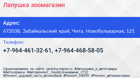 Лапушка, зоомагазин по адресу 672038, Забайкальский край, Чита, Новобульварная, 121 в дальнейшем Организация, размещена в следующих категориях:
