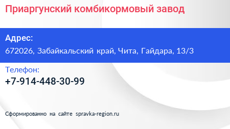 Приаргунский комбикормовый завод по адресу 672026, Забайкальский край, Чита, Гайдара, 13/3 в дальнейшем Организация, размещена в следующих категориях: