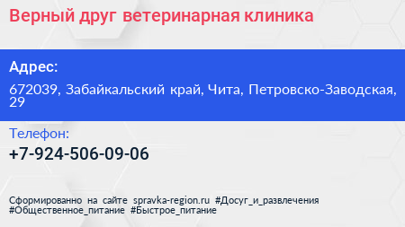 Верный друг, ветеринарная клиника по адресу 672039, Забайкальский край, Чита, Петровско-Заводская, 29 в дальнейшем Организация, размещена в следующих категориях: