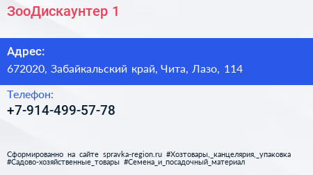 ЗооДискаунтер №1 по адресу 672020, Забайкальский край, Чита, Лазо, 114 в дальнейшем Организация, размещена в следующих категориях: