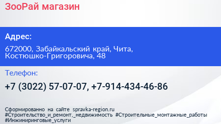 ЗооРай, магазин по адресу 672000, Забайкальский край, Чита, Костюшко-Григоровича, 48 в дальнейшем Организация, размещена в следующих категориях: