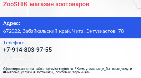 ZooSHIK, магазин зоотоваров по адресу 672022, Забайкальский край, Чита, Энтузиастов, 78 в дальнейшем Организация, размещена в следующих категориях: