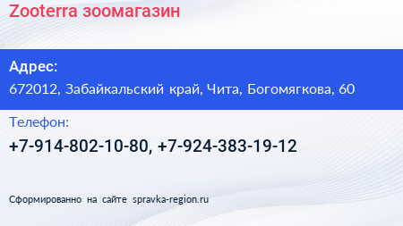 Zooterra, зоомагазин по адресу 672012, Забайкальский край, Чита, Богомягкова, 60 в дальнейшем Организация, размещена в следующих категориях: