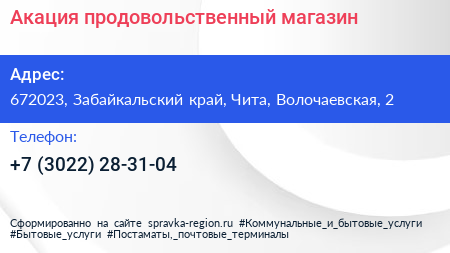 Акация, продовольственный магазин по адресу 672023, Забайкальский край, Чита, Волочаевская, 2 в дальнейшем Организация, размещена в следующих категориях: