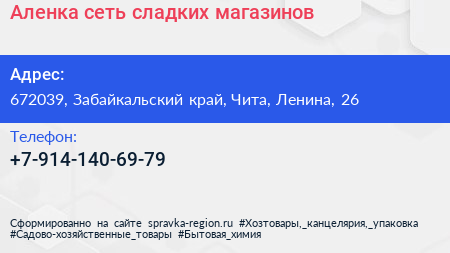 Аленка, сеть сладких магазинов по адресу 672039, Забайкальский край, Чита, Ленина, 26 в дальнейшем Организация, размещена в следующих категориях:
