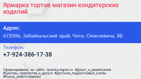 Ярмарка тортов, магазин кондитерских изделий по адресу 672006, Забайкальский край, Чита, Онискевича, 8Б в дальнейшем Организация, размещена в следующих категориях: