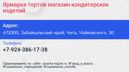 Ярмарка тортов, магазин кондитерских изделий по адресу 672000, Забайкальский край, Чита, Чайковского, 30 в дальнейшем Организация, размещена в следующих категориях: