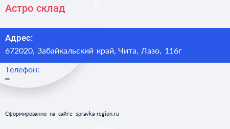 Астро-склад по адресу 672020, Забайкальский край, Чита, Лазо, 116г в дальнейшем Организация, размещена в следующих категориях: