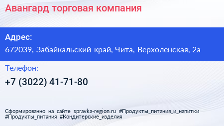 Авангард, торговая компания по адресу 672039, Забайкальский край, Чита, Верхоленская, 2а в дальнейшем Организация, размещена в следующих категориях: