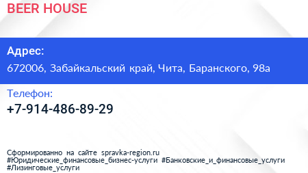 BEER HOUSE по адресу 672006, Забайкальский край, Чита, Баранского, 98а в дальнейшем Организация, размещена в следующих категориях: