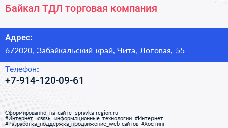 Байкал ТДЛ, торговая компания по адресу 672020, Забайкальский край, Чита, Логовая, 55 в дальнейшем Организация, размещена в следующих категориях: