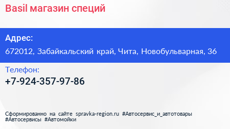 Basil, магазин специй по адресу 672012, Забайкальский край, Чита, Новобульварная, 36 в дальнейшем Организация, размещена в следующих категориях: