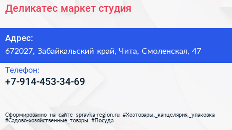 Деликатес, маркет-студия по адресу 672027, Забайкальский край, Чита, Смоленская, 47 в дальнейшем Организация, размещена в следующих категориях: