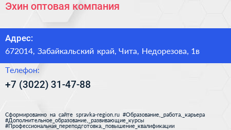 Эхин, оптовая компания по адресу 672014, Забайкальский край, Чита, Недорезова, 1в в дальнейшем Организация, размещена в следующих категориях: