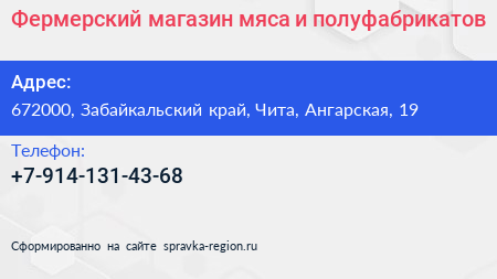 Фермерский, магазин мяса и полуфабрикатов по адресу 672000, Забайкальский край, Чита, Ангарская, 19 в дальнейшем Организация, размещена в следующих категориях: