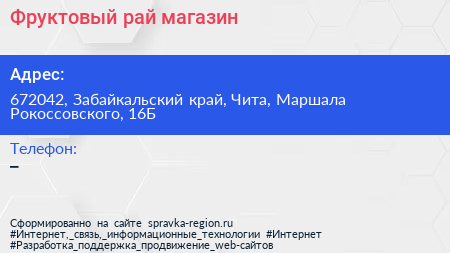 Фруктовый рай, магазин по адресу 672042, Забайкальский край, Чита, Маршала Рокоссовского, 16Б в дальнейшем Организация, размещена в следующих категориях: