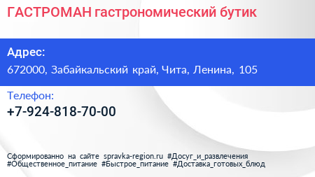 ГАСТРОМАН, гастрономический бутик по адресу 672000, Забайкальский край, Чита, Ленина, 105 в дальнейшем Организация, размещена в следующих категориях: