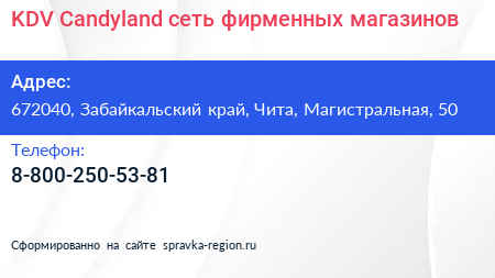 KDV Candyland, сеть фирменных магазинов по адресу 672040, Забайкальский край, Чита, Магистральная, 50 в дальнейшем Организация, размещена в следующих категориях: