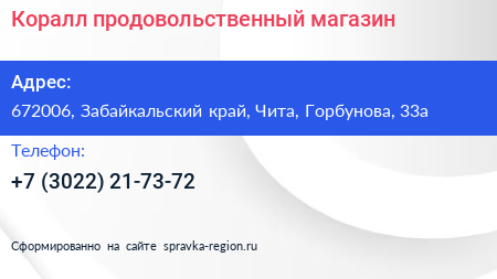 Коралл, продовольственный магазин по адресу 672006, Забайкальский край, Чита, Горбунова, 33а в дальнейшем Организация, размещена в следующих категориях: