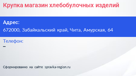 Крупка, магазин хлебобулочных изделий по адресу 672000, Забайкальский край, Чита, Амурская, 64 в дальнейшем Организация, размещена в следующих категориях: