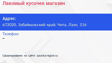 Лакомый кусочек, магазин по адресу 672020, Забайкальский край, Чита, Лазо, 116 в дальнейшем Организация, размещена в следующих категориях: