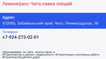 Лемонграсс Чита, лавка специй по адресу 672000, Забайкальский край, Чита, Ленинградская, 58 в дальнейшем Организация, размещена в следующих категориях: