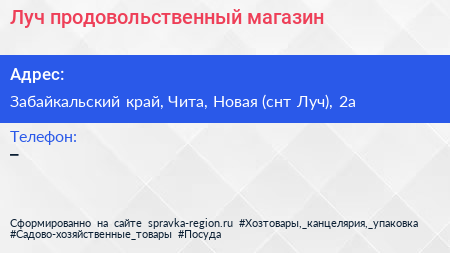 Луч, продовольственный магазин по адресу Забайкальский край, Чита, Новая (снт Луч), 2а в дальнейшем Организация, размещена в следующих категориях: