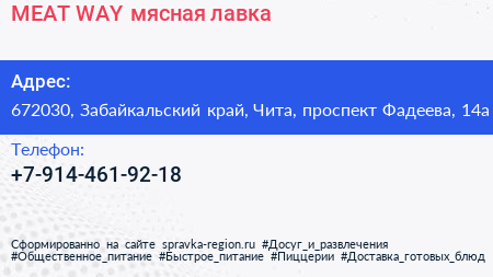 MEAT WAY, мясная лавка по адресу 672030, Забайкальский край, Чита, проспект Фадеева, 14а в дальнейшем Организация, размещена в следующих категориях: