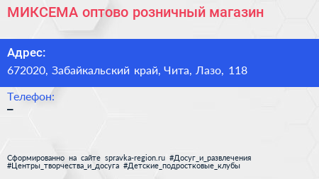 МИКСЕМА, оптово-розничный магазин по адресу 672020, Забайкальский край, Чита, Лазо, 118 в дальнейшем Организация, размещена в следующих категориях: