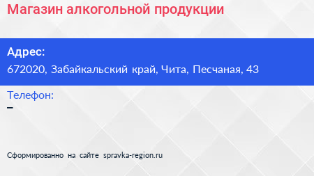 Магазин алкогольной продукции по адресу 672020, Забайкальский край, Чита, Песчаная, 43 в дальнейшем Организация, размещена в следующих категориях: