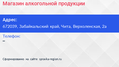 Магазин алкогольной продукции по адресу 672039, Забайкальский край, Чита, Верхоленская, 2а в дальнейшем Организация, размещена в следующих категориях: