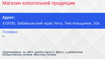 Магазин алкогольной продукции по адресу 672030, Забайкальский край, Чита, Текстильщиков, 10а в дальнейшем Организация, размещена в следующих категориях: