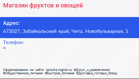 Магазин фруктов и овощей по адресу 672027, Забайкальский край, Чита, Новобульварная, 5 в дальнейшем Организация, размещена в следующих категориях: