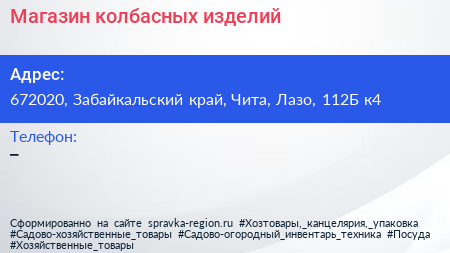 Магазин колбасных изделий по адресу 672020, Забайкальский край, Чита, Лазо, 112Б к4 в дальнейшем Организация, размещена в следующих категориях: