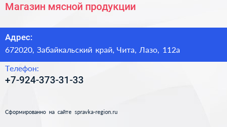 Магазин мясной продукции по адресу 672020, Забайкальский край, Чита, Лазо, 112а в дальнейшем Организация, размещена в следующих категориях: