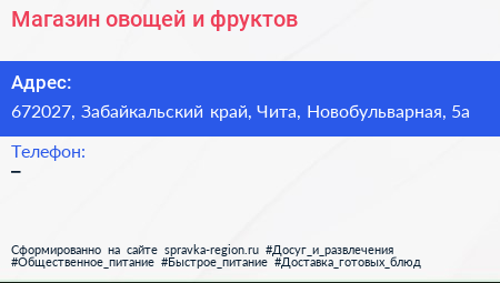 Магазин овощей и фруктов по адресу 672027, Забайкальский край, Чита, Новобульварная, 5а в дальнейшем Организация, размещена в следующих категориях: