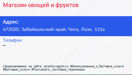 Магазин овощей и фруктов по адресу 672020, Забайкальский край, Чита, Лазо, 112а в дальнейшем Организация, размещена в следующих категориях: