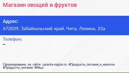 Магазин овощей и фруктов по адресу 672039, Забайкальский край, Чита, Ленина, 25а в дальнейшем Организация, размещена в следующих категориях:
