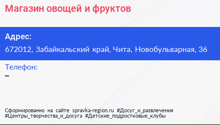 Магазин овощей и фруктов по адресу 672012, Забайкальский край, Чита, Новобульварная, 36 в дальнейшем Организация, размещена в следующих категориях:
