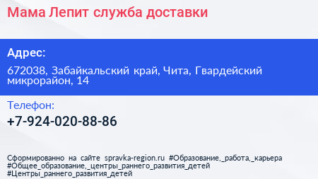 Мама Лепит, служба доставки по адресу 672038, Забайкальский край, Чита, Гвардейский микрорайон, 14 в дальнейшем Организация, размещена в следующих категориях: